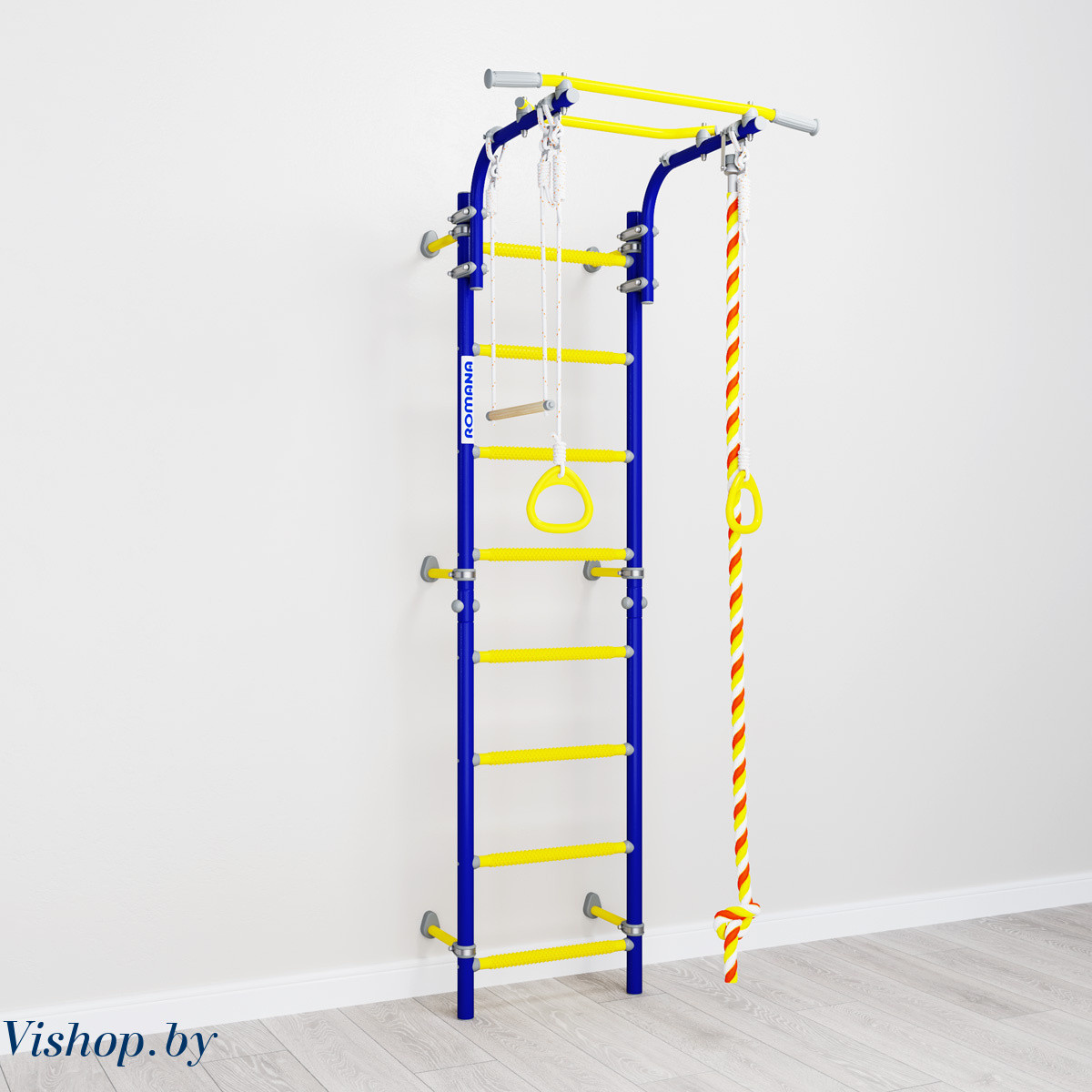 Детский спортивный комплекс ROMANA Next Top - настоящий хит в линейке шведских стенок. Он легко собирается и фиксируется к стене с помощью подвижных крепежей. Они позволяют зафиксировать стенку в различных положениях, включая угловое. Можно рационально расположить крепеж на той высоте, которая вас устроит, и избежать попадания в проводку или полости в стене.Одно из важных преимуществ этого ДСК - регулируемый турник, который фиксируется надежными хомутами. Его можно установить на лестнице на любую высоту. В зависимости от возраста ребенка, турник можно перевесить повыше или пониже.