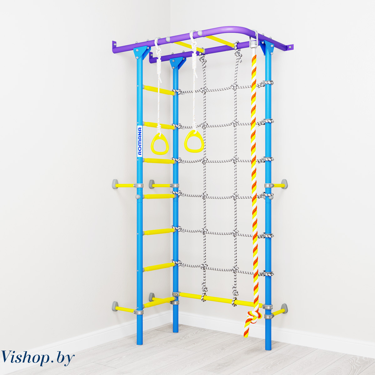 У детского спортивного комплекса ROMANA S4 оригинальная конструкция и расположение элементов. На рукоход можно разместить разнообразное навесное оборудование. В комплекте предусмотрены канат, кольца и канатный лаз шириной 80 см из крепкого шнура. Конструкция выдерживает вес до 100 кг (нагрузка при испытаниях — 200 кг). Ступени лестницы обладают массажным эффектом, развивая мелкую моторику.Комплектация: канат, кольца гимнастические, веревочный лаз, рукоход.