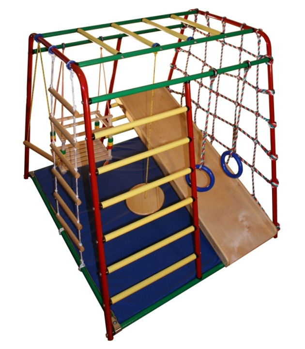 Мы продаем детские спортивные комплексы "Веселый малыш" по минимальным рекомендуемым розничным ценам от ОФИЦИАЛЬНОГО производителя!!! Металлические детские спортивные комплексы Металлические детские спортивные комплексы всегда были популярны. ДСК "Веселый малыш" - качественнейший образец, который отличается повышенной безопасностью и компактностью (можно поставить в обычной среднестатистической квартире). ДСК "Веселый малыш" - полностью сборно-разборная конструкция, устанавливается на пол и при необходимости передвигается с места на место. В отличии от аналогов, где применяются саморезы, этот комплекс собран с применением винтов. Детский спортивный комплекс с сеткой ДСК Вертикаль "Весёлый малыш" – это полноценная площадка для интересных игр и развивающих занятий! Полная комплектация содержит сетку-паутинку, с помощью которой ребенок учится координировать свои движения, пытаясь взобраться наверх. Детский спортивный комплекс с сеткой полезен с самого малого возраста – даже годовалый малыш может пробовать свои силы (с поддержкой взрослых). Детский спортивный комплекс с горкой Фанерная горка – весьма функциональное дополнение комплекса. Детский спортивный комплекс с горкой предназначен для веселого катания ребятишек. В детском спортивном комплексе "Веселый малыш" высота установки горки регулируется. Детский спортивный комплекс с качелями ДСК «Веселый малыш» укомплектован веревочными качелями в отличии от других металлических комплексов, которые не обладают такими широкими возможностями. Детский спортивный комплекс с качелями также содержит диск-тарзанку, которая учит ребенка удерживать равновесие. Детский спортивный комплекс размеры Этот детский спортивный комплекс размеры имеет идеально подходящие для среднестатистической комнаты - 1,31 х 1,07 м. Достаточно освободить угол детской от горы игрушек – и вот уже у вашего малыша есть собственный мобильный спортивный зал! При желании Вы можете установить комплекс на улице: на дачном участке или территории частного дома. Только в дождливую погоду необходимо убирать гимнастический мат и комплекс в сухое закрытое помещение, чтобы он не отсырел и прослужил Вам, как можно дольше. В комплект входит 2 ключа - шестигранника и инструкция по сборке. Собирается комплекс легко, как конструктор, в течение 1 - 1,5ч. При желании вы можете заказать у нас сборку за дополнительную плату. Родительское тепло – это то, что чарующим образом делает ребенка по-настоящему счастливым и жизнерадостным. Психологи утверждают, что стоит ежедневно обнимать малыша 8 раз – и он буквально расцветет на глазах: будет чувствовать себя защищенным и самым нужным на Земле! Если к этому прибавить каждодневные занятия на детском комплексе «Веселый малыш» - Ваш ребенок станет не только счастливым, но и здоровым!
